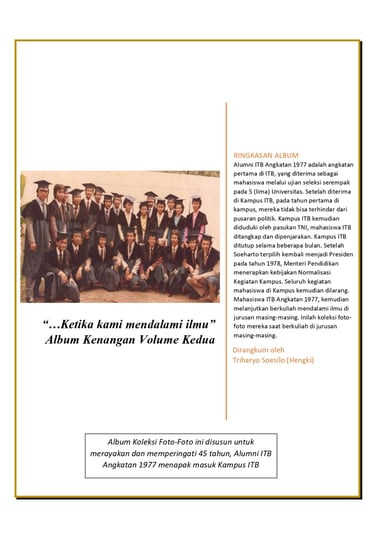Buku Reuni 45 Tahun ITB77 – “Ketika Kami mendalami Ilmu (Album Kenangan Volume Kedua)”. Silahkan download secara gratis pada https://triharyosoesilo.myr.id/ebook/Reuni-45-tahun-ITB77-ketika-kami-mendalami-ilmu-album-kenangan-volume-kedua